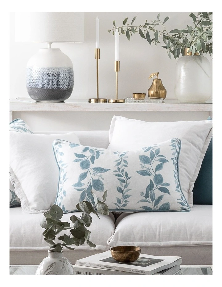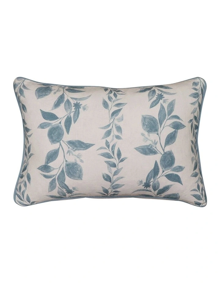 One side digital print on off white linen with plain off white linen reverse and matching solid blue piping. Concealed zip.