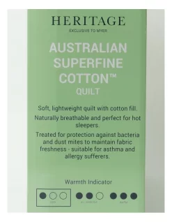 Our Heritage Australian Superfine Cotton Light Weight Quilt is cool, soft and lightweight. With a cotton fill, this quilt is ideal for warmer climates. It offers natural breathability and is perfect for hot sleepers. Treated for protection against bacteria and dust mites to maintain fabric freshness this quilt is suitable for asthma and allergy sufferers.Â