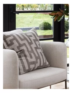 One side digital print on natural linen with plain natural linen reverse and piping. Concealed zip.