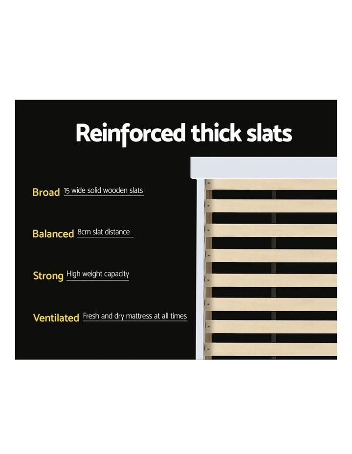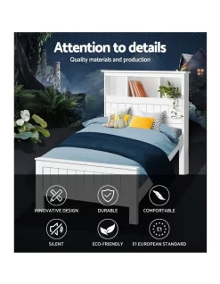 Made of natural pine wood, the Artiss Conqueror Bed Frame is ideal for kids as it for any adult. Strong and sturdy, the bed frame comes with a solid plywood slated base, reinforced supports across the frame, heavy-duty steel fixings and smooth edges all round. Finished in a non-toxic, eco-friendly white paint, the neutral coloured bed frame is also very practical with ample storage from a headboard that comprises three open compartments and a closed shelf that folds down as well as more room beneath the bed frame for optional trundle drawers or any storage boxes. Fact it, this charming bed frame is designed to please in more ways than one.
