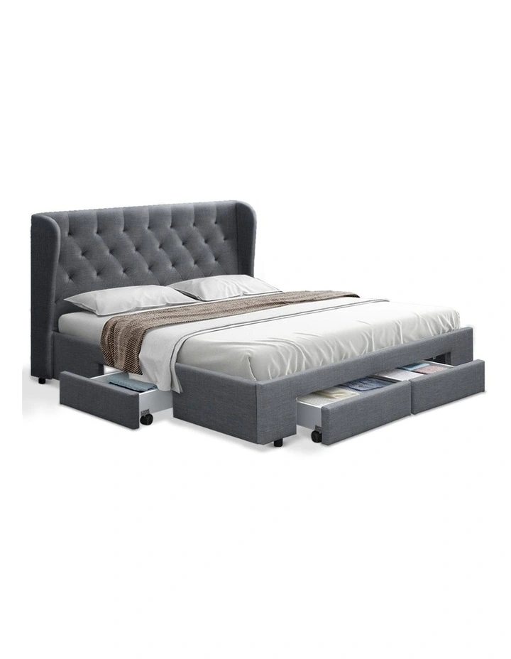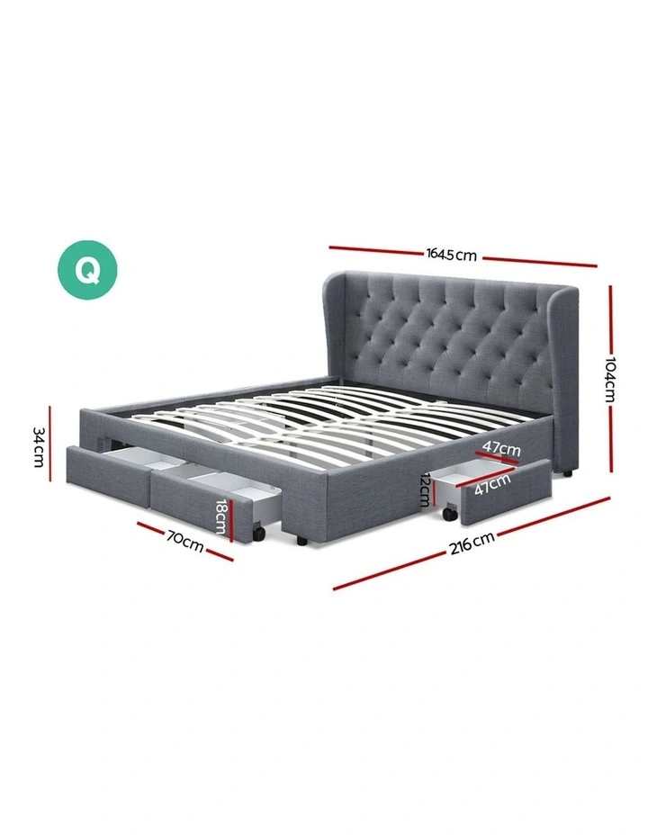Of particular interest is the tufted headboard that really gives the Bed Frame a designer-class status. Simply oozing with elegance and sophistication in every detail. Whats more, underneath the Bed Frame, youll find four spacious drawers to store all your seasonal beddings and linen and a host of other personal essentials. No more clutter and loads of useable storage right under you. Better still, the drawers are set on wheels for easy access sliding in and out.
