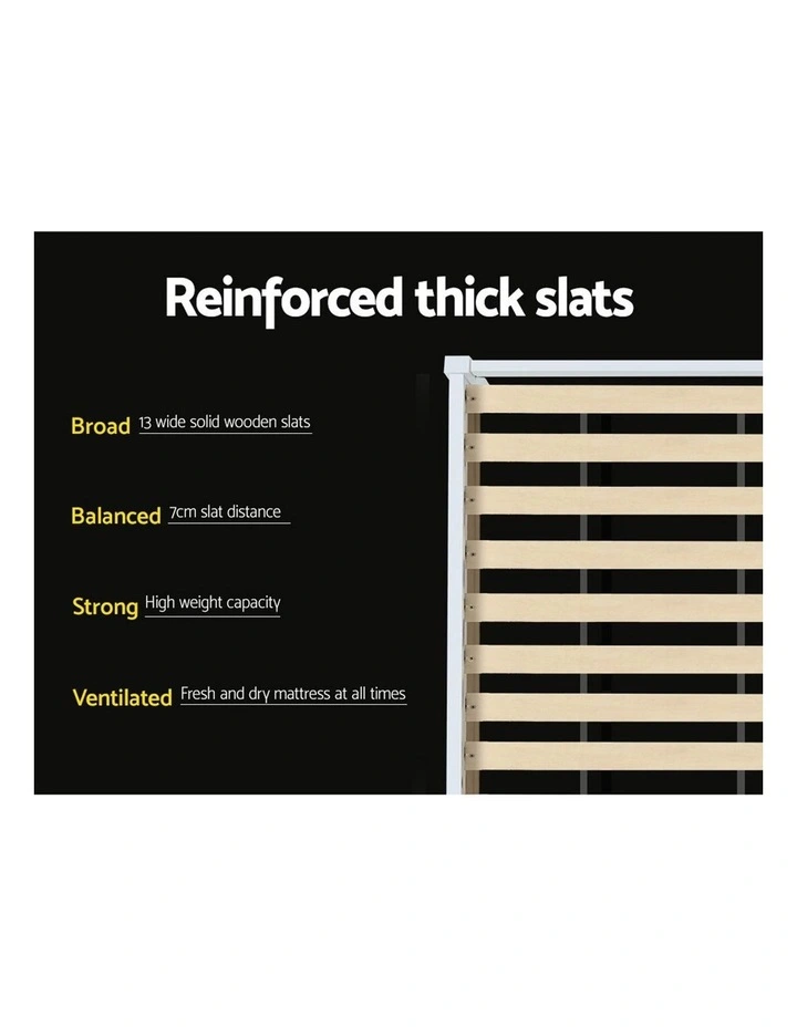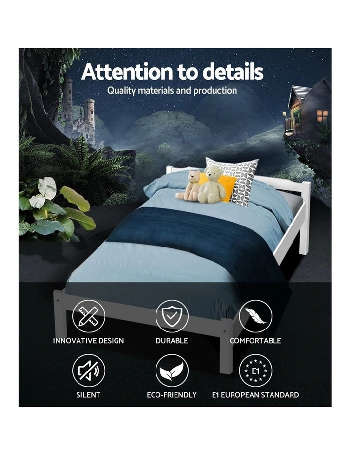 Strong and sturdy, the Bed Frame comes with a durable plywood slated base, reinforced angled brackets for long term support, stylish headboard, heavy-duty steel fixings and smooth edges all round. Finished in a non-toxic, eco-friendly white paint, the neutral-coloured Bed Frame makes for easy dcor coordination with any bedroom. Better still, the Bed Frame also has ample space below to fit in a pair of optional trundle drawers for extra storage of bedding essentials.